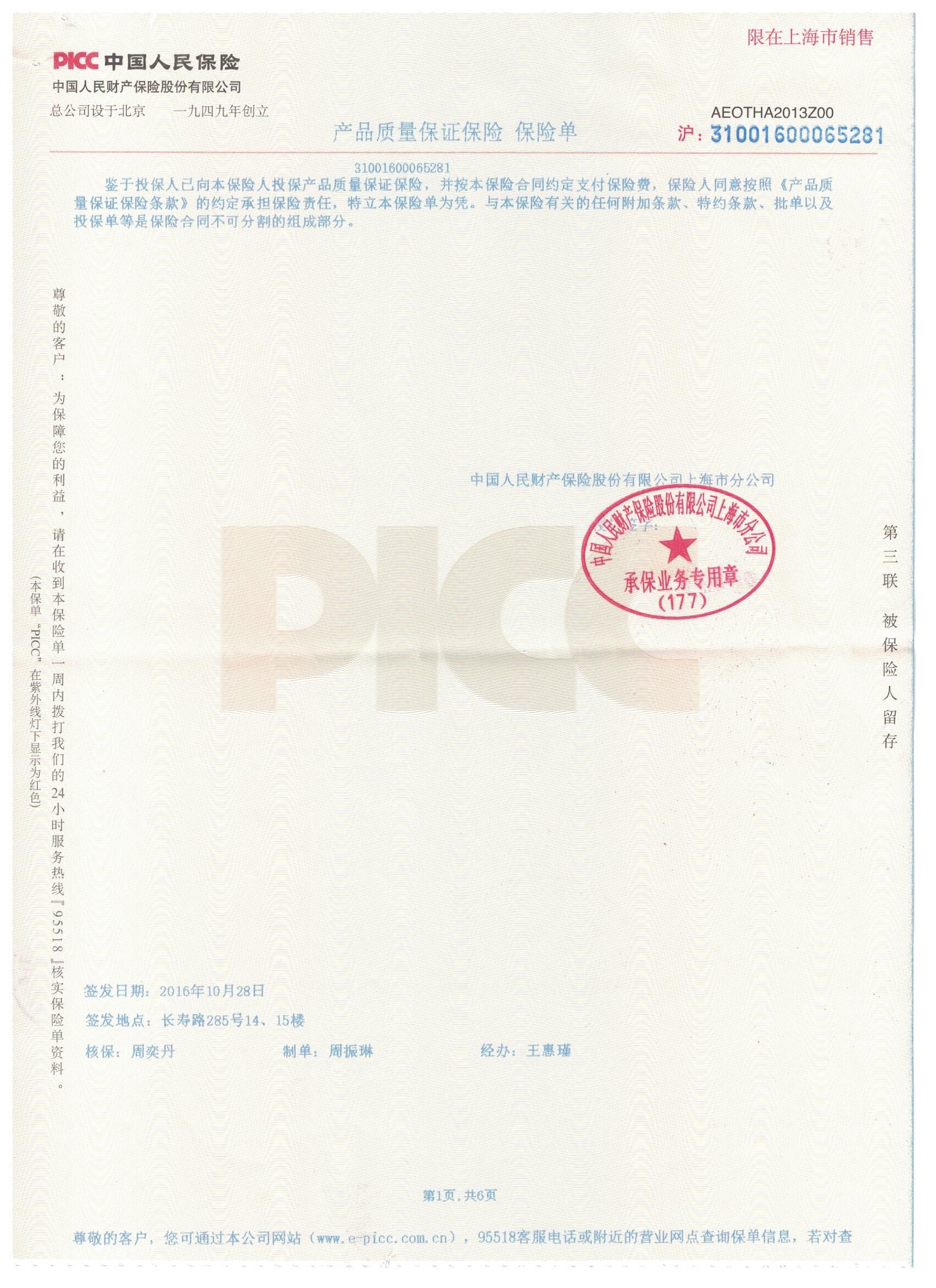 公司產品由中國人民財產保險股份公司質量承保