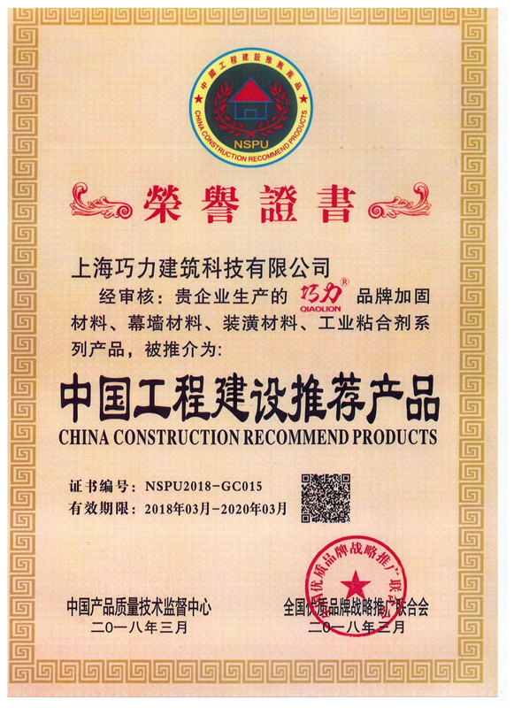 經過十幾年的發展,上海巧力公司已形成加固材料、幕墻材料、裝潢材料、防腐材料和工業粘合劑五大系列產品,共五十多種型號。產品廣泛應用于國內外建筑工程項目施工中,在高鐵、車站、機場、道理、橋梁、碼頭、水庫、體育館、博物館、通信機房、大型商場等重大項目中的成功應用,獲得了業主和施工方的肯定。