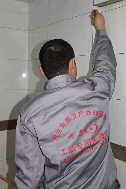 3、使用安裝好的膠槍,將美縫膠打入清理干凈的瓷磚縫隙。(膠槍與墻面成45°)。