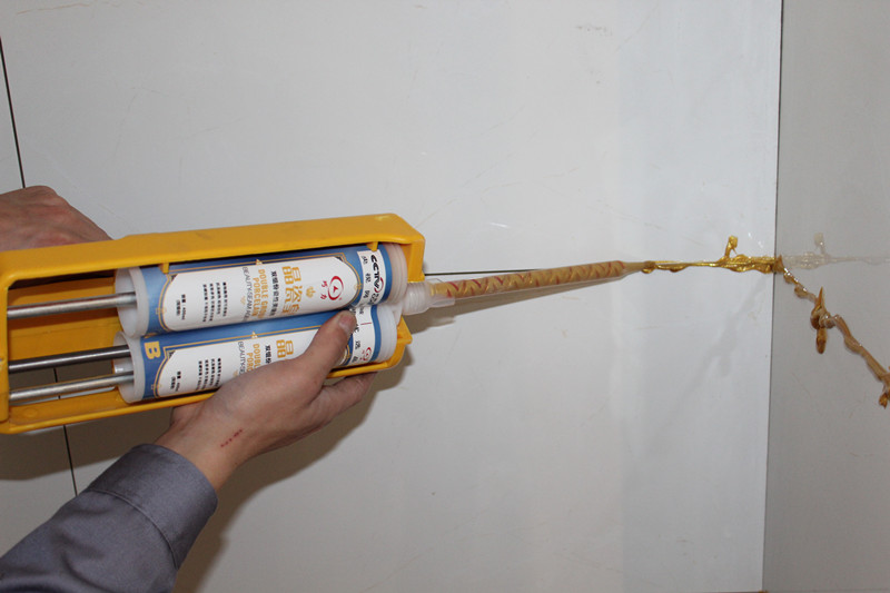 1、擰開美縫膠瓶蓋,先安裝專用膠嘴,再套上優(yōu)質(zhì)省力膠槍,膠嘴出膠前讓膠嘴朝上打膠,待兩種組份都擠壓出來后,前端未能混合均勻部分去除,混合均勻膠體方可施工。